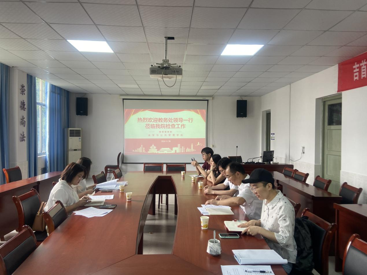 学期过半,为深入了解本学期教学的整体运行情况,确保教学工作平稳有序进行,提高教育教学质量,5月28日上午,mk体育官网教务处副处长谌晓安,质量科科长尹小兰到法管学院检查指导mk体育官网各项教学工作。副院长(主持工作)郑牧民,副院长吴永清及法学系主任向准、公共管理系主任林旭鑫、教务办秘书周彦君、实验室主任吴楠陪同检查并汇报学院工作。