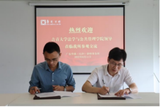 6月11日上午,mk体育官网与广东华商(长沙)律师事务所(以下称“华商长沙律师事务所”)社会实践基地签约仪式隆重举行。院党委书记彭献忠、副院长郑牧民、法律系主任向达赴华商长沙律师事务所与律所合伙人黄纯安、江文卓,律所律师曾凡亮进行深入交流,双方分别就学院和事务所情况做了简要介绍,并就应用型法律人才培养、校企合作新模式探索、社会实践基地共建达成共识,签署相关合作协议。