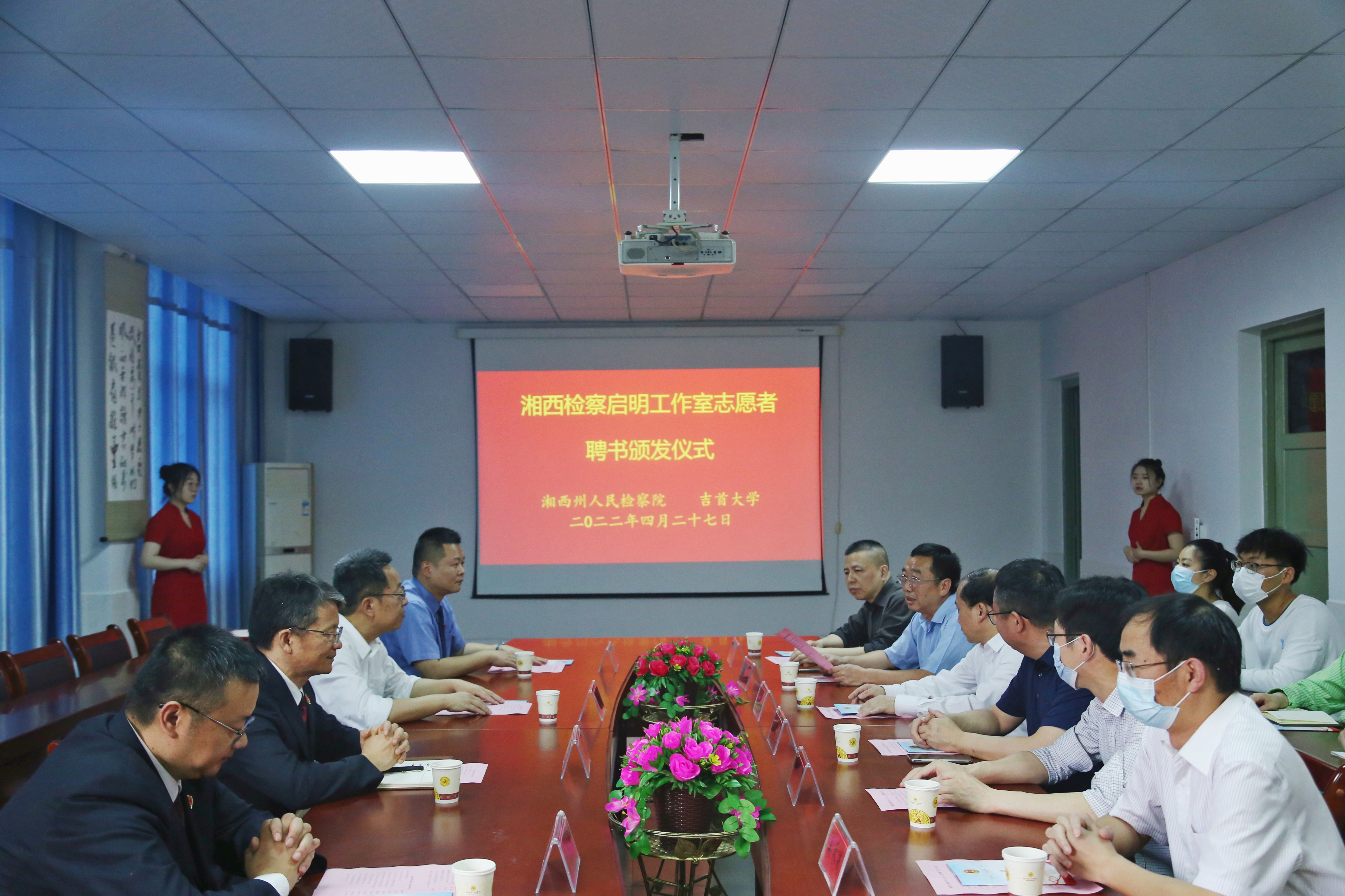 本网讯(学生记者 徐毅豪 通讯员 陶伊涵 侯琳馨)为进一步推动检校共建工作,切实发挥湘西州人民检察院作为MK体育,MKsports,mk体育官网教学实习基地的作用,培养在校大学生服务社会、乐于奉献的品德。4月27日下午,湘西检察启明工作室志愿者聘书颁发仪式在我校MK体育,MKsports,mk体育官网会议室举行。校党委书记廖志坤,湘西州人民检察院党组书记、检察长谈固,吉首市人民检察院第四检察部(启明工作室)主任李启明等出席会议。会议由MK体育,MKsports,mk体育官网党委书记彭献忠主持。