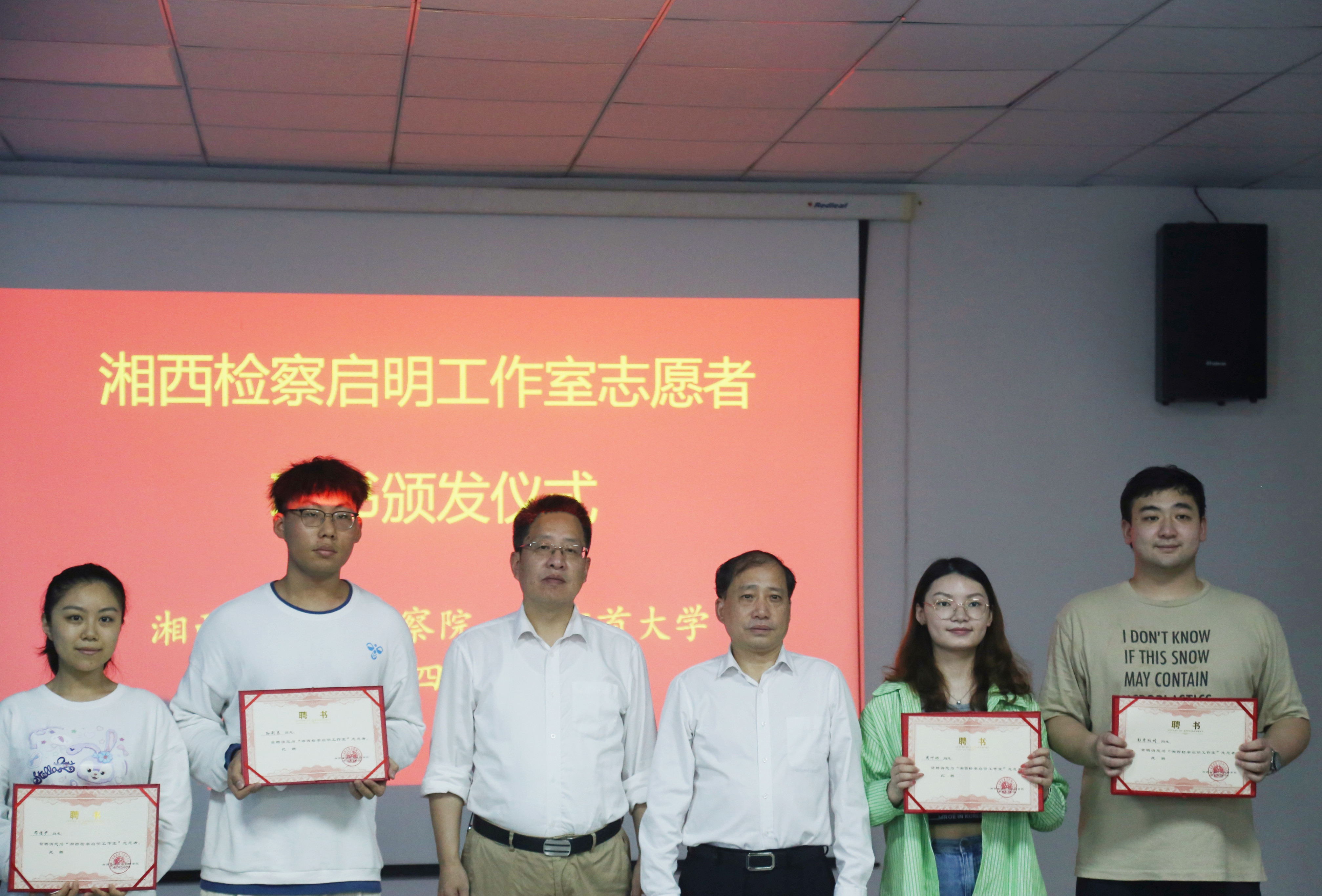 此次湘西检察启明工作室在我校拟聘任198名大学生作为志愿者,在检察机关和学校的共同指导下开展相关志愿者活动。廖志坤、谈固为学生志愿者代表颁发聘书并合影。