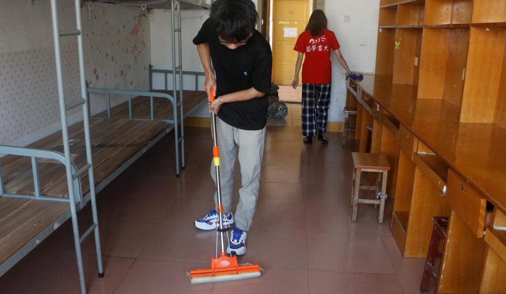 图为 学生党员打扫宿舍 谭海脆摄 |