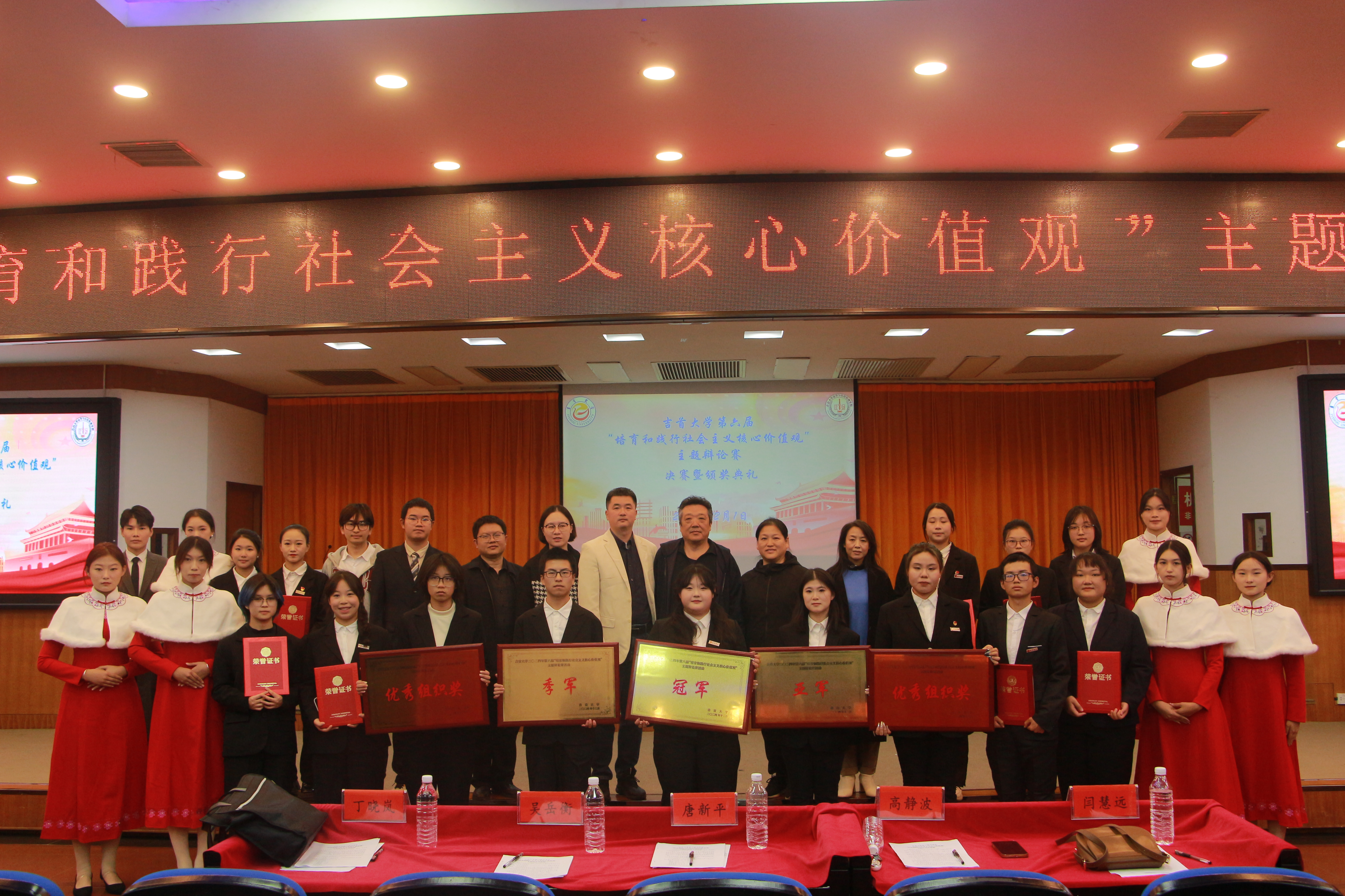 12月1日,mk体育官网第六届“培育和践行社会主义核心价值观”主题辩论赛决赛暨颁奖典礼在砂子坳校区模拟法庭隆重举行。校关工委常务副主任唐新平、党委组织部副部长吴岳衡、招生就业处副处长高静波、团委副书记丁晓岚、党委宣传部理论科科长闫慧远等领导受邀担任评委。