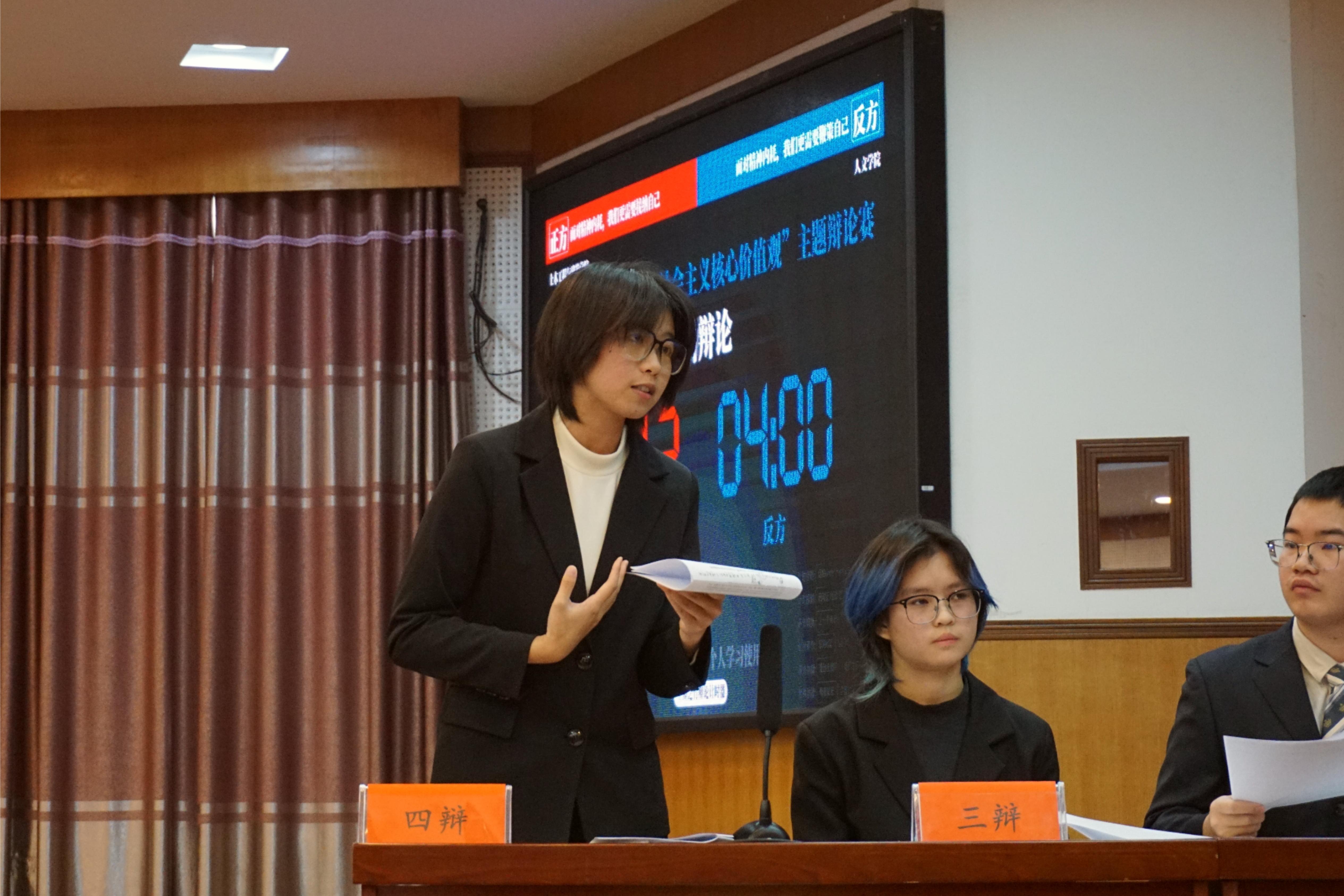 此次比赛分为季军争夺赛和冠军争夺赛两场进行。在季军争夺赛中,双方辩手围绕“面对精神内耗,我们更需要接纳自己还是鞭策自己?”这一辩题展开了激烈的交锋。他们不仅就如何有效缓解精神内耗、如何从容应对挑战、如何不断突破自我进行了深入的讨论和交流,展现了出色的辩论技巧和逻辑思维。