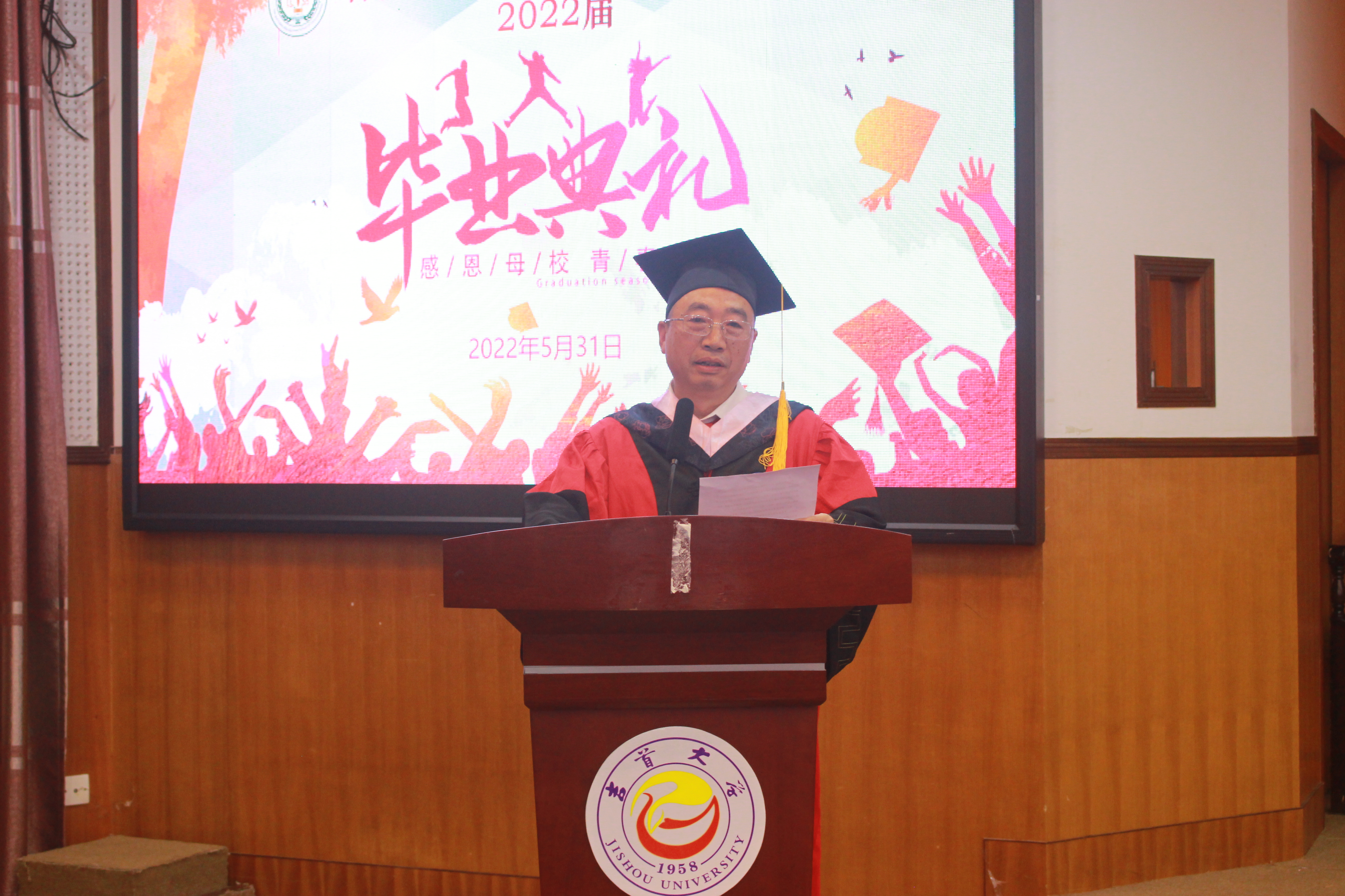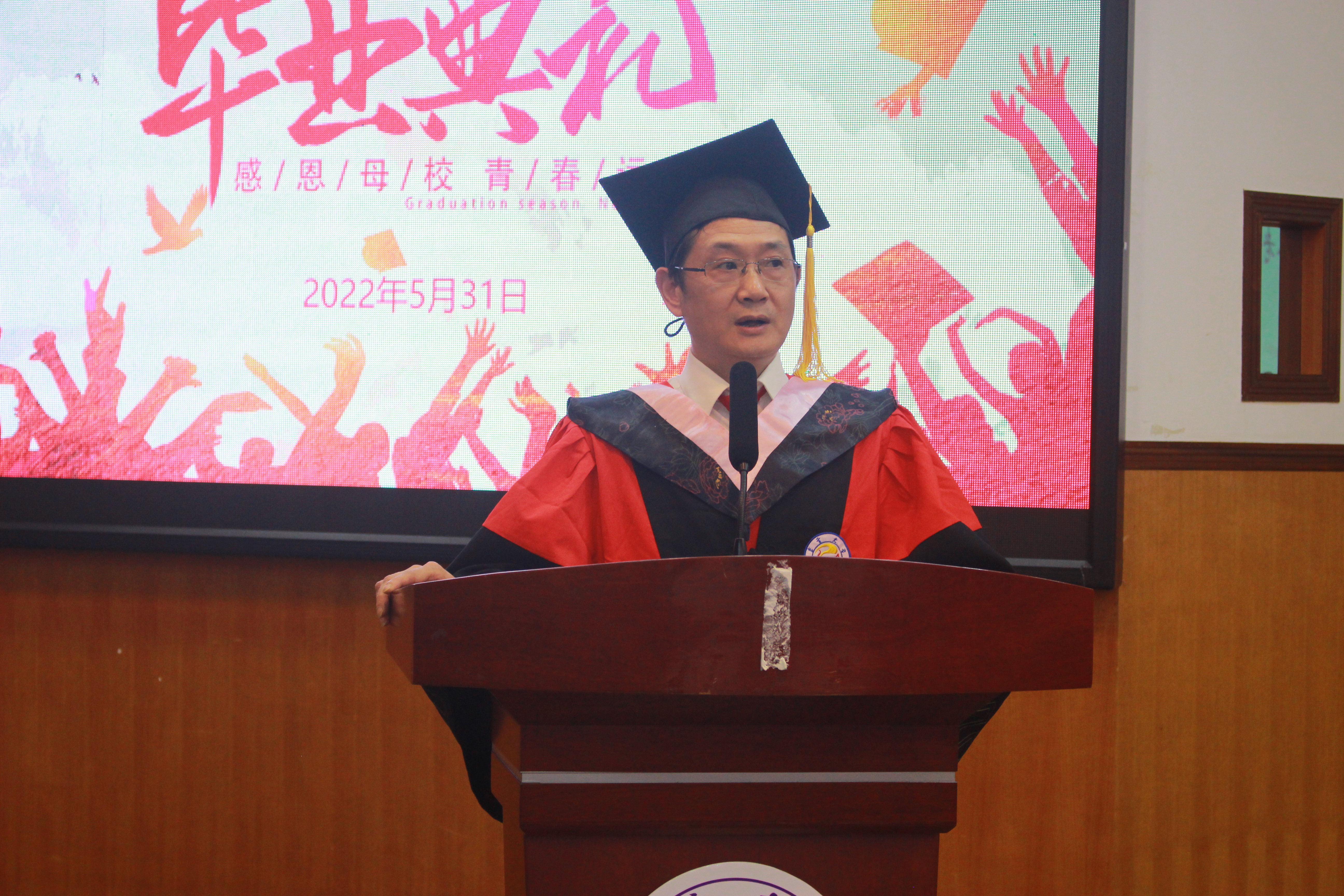 本次毕业典礼在庄严的国歌声中拉开序幕,主持人魏风劲首先介绍了出席的领导老师。其后,彭献忠为毕业生致辞,他表达了对2022届毕业生们的真心祝贺,并向毕业生们提出了三点期望:学会感恩、坚守真理、志存高远。希望每一个走出吉大的学子永远不忘国家、家庭和母校,在未来的征途上勇敢坚定地走好自己的路、坚持自己理性的判断,将自己的理想同祖国的前途紧密联系在一起,努力成为担当民族复兴大任的时代新人。