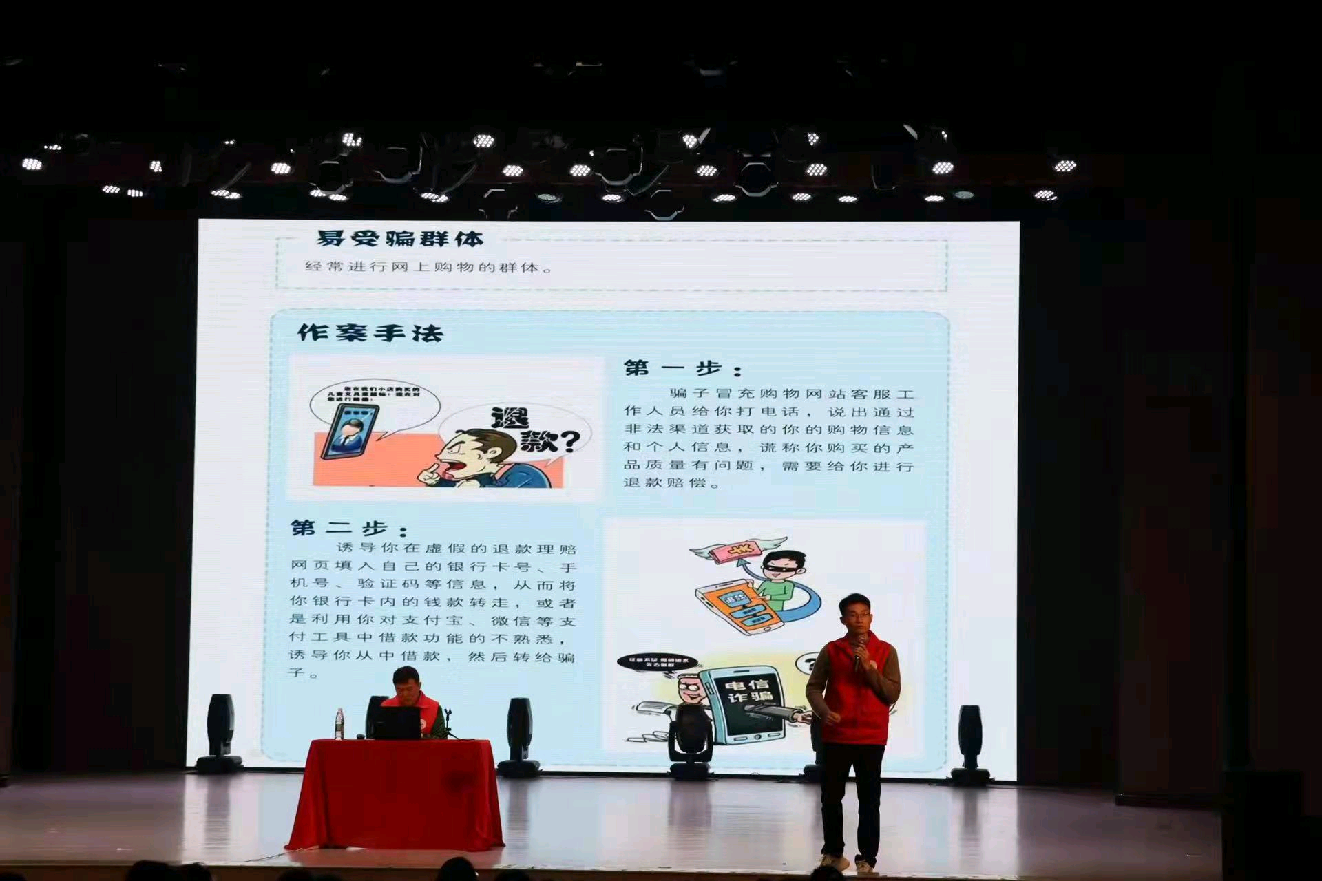 11月3日晚,校园反诈宣讲系列活动第一场——mk体育官网音乐舞蹈学院专场中,“典”亮湘西法律志愿服务团宣讲组代表王忠威从典型案例出发,通过分析常见诈骗作案手法,向在场的同学解读了通讯网络诈骗犯罪的常见情况,如网络贷款诈骗结合“大学生马某网贷被骗”案、刷单返利诈骗结合”大二学生张某刷单被骗”案等,提醒在座的同学们提高防范意识。