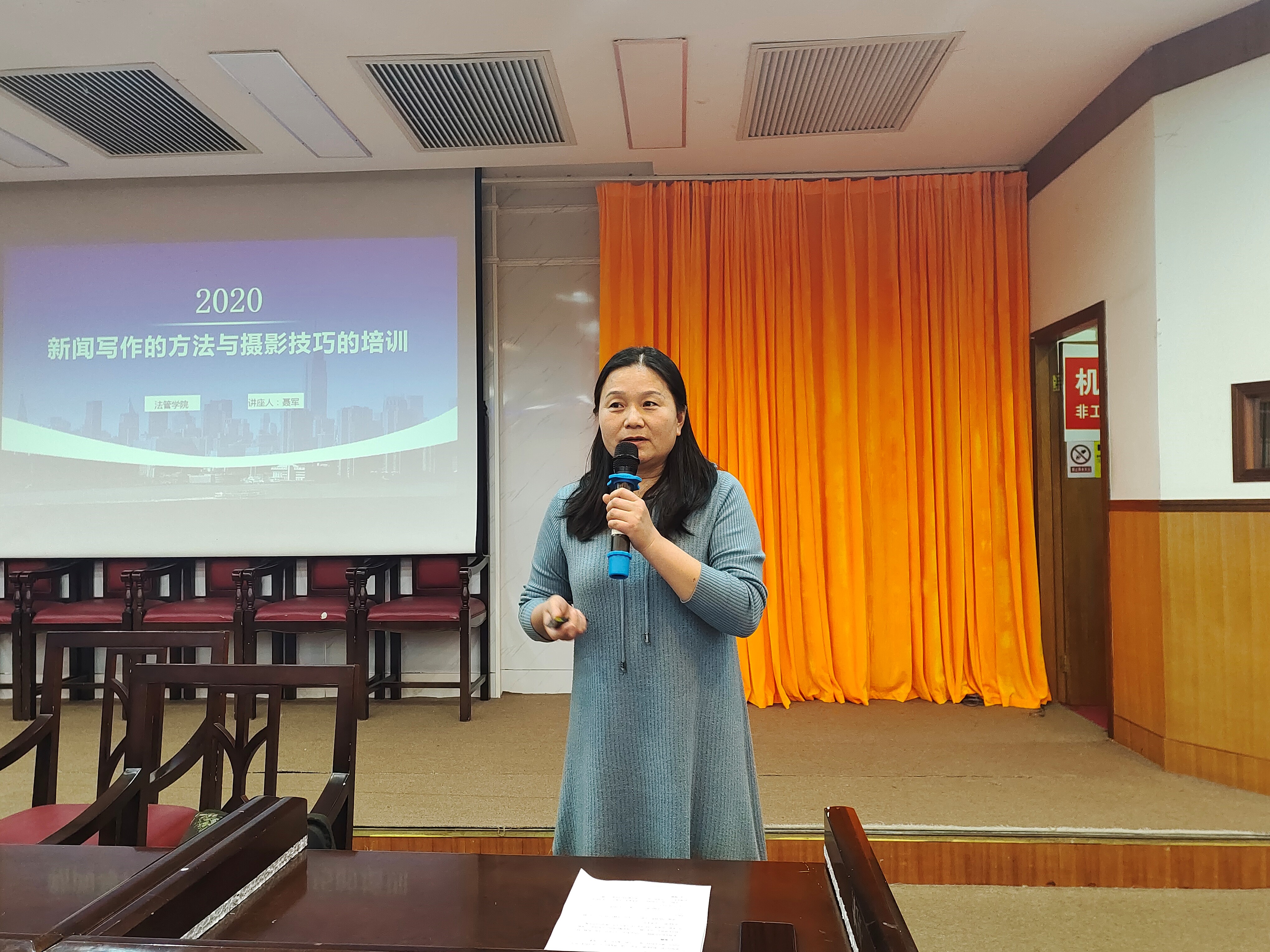 聂军则从新闻写作的方法与摄影技巧两个方面展开讲述。首先,她对新闻写作的标题准确概括主题、导语按照倒金字塔结构布局、背景补充适当、主体以时序结构布局谋篇、结尾形式多样等五个部分做了详细阐述,还提醒学生写稿前要充分做好功课、出稿及时。