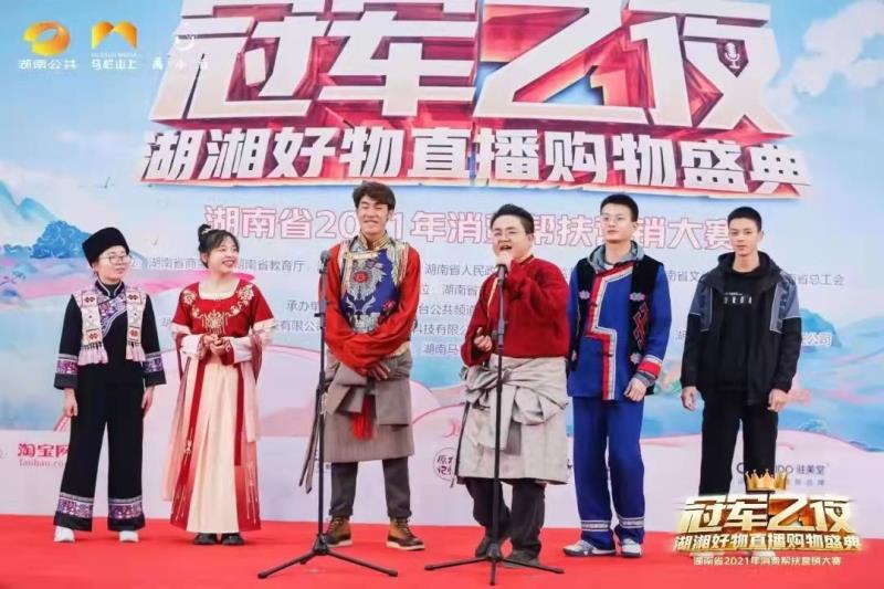 本网讯(通讯员 欧阳静 柳盈)为助力乡村振兴,巩固脱贫攻坚成果,12月8日下午3点至晚上11点,在蒲钰希老师带领下,由mk体育官网六名公管专业学生组成的帮扶营销队“苗疆雪鹰队”在湖南广播电视台参加2021湖南消费帮扶营销大赛决赛——“冠军之夜”。