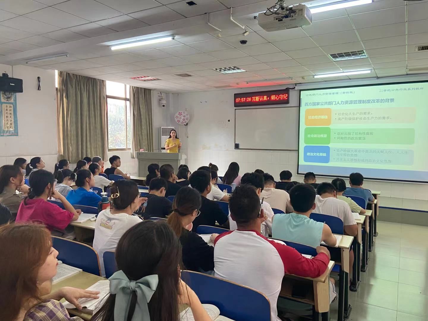 本网讯(通讯员 柳盈)9月27日上午,副校长王艳一行莅临MK体育,MKsports,mk体育官网检查指导新学期开学工作。在学院党委书记彭献忠、副书记陈蓉,副院长魏风劲、郑牧民,教学督导专家高长富教授,公管系系主任吴永清等的陪同下,王艳一行首先来到总理楼60120教室,从课程内容、教学形式、教学质量等方面对朱颖老师主讲的《人力资源开发与管理》课程的开学第一课进行了细致的考察。