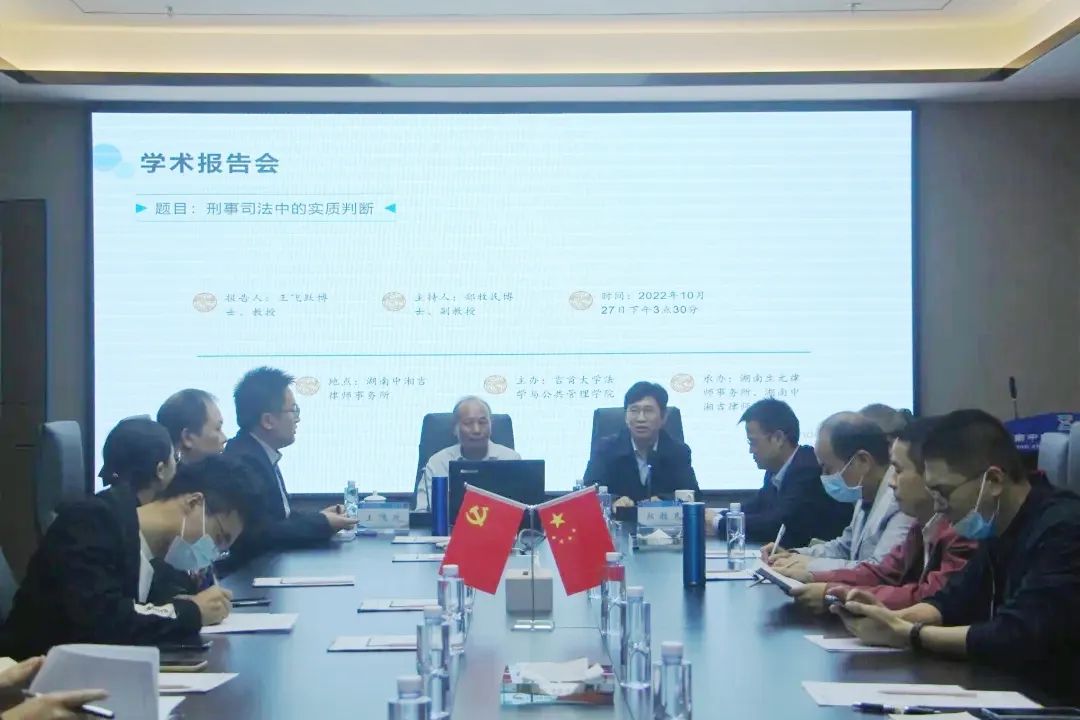 本网讯(通讯员 刘媛 欧阳静)为促进学术交流,有效提高教学和科研水平,共创良好的学术氛围,10月27日,中南林业科技大学政mk体育官网院长王飞跃教授应邀做了题为《刑事司法中的实质判断》的学术报告。本次讲座由MK体育,MKsports,mk体育官网主办,实践基地湖南中湘吉律师事务所、湖南生元律师事务所联合承办。讲座由郑牧民副院长主持,MK体育,MKsports,mk体育官网部分师生、中湘吉所和生元所部分律师共20余人参加了报告会。